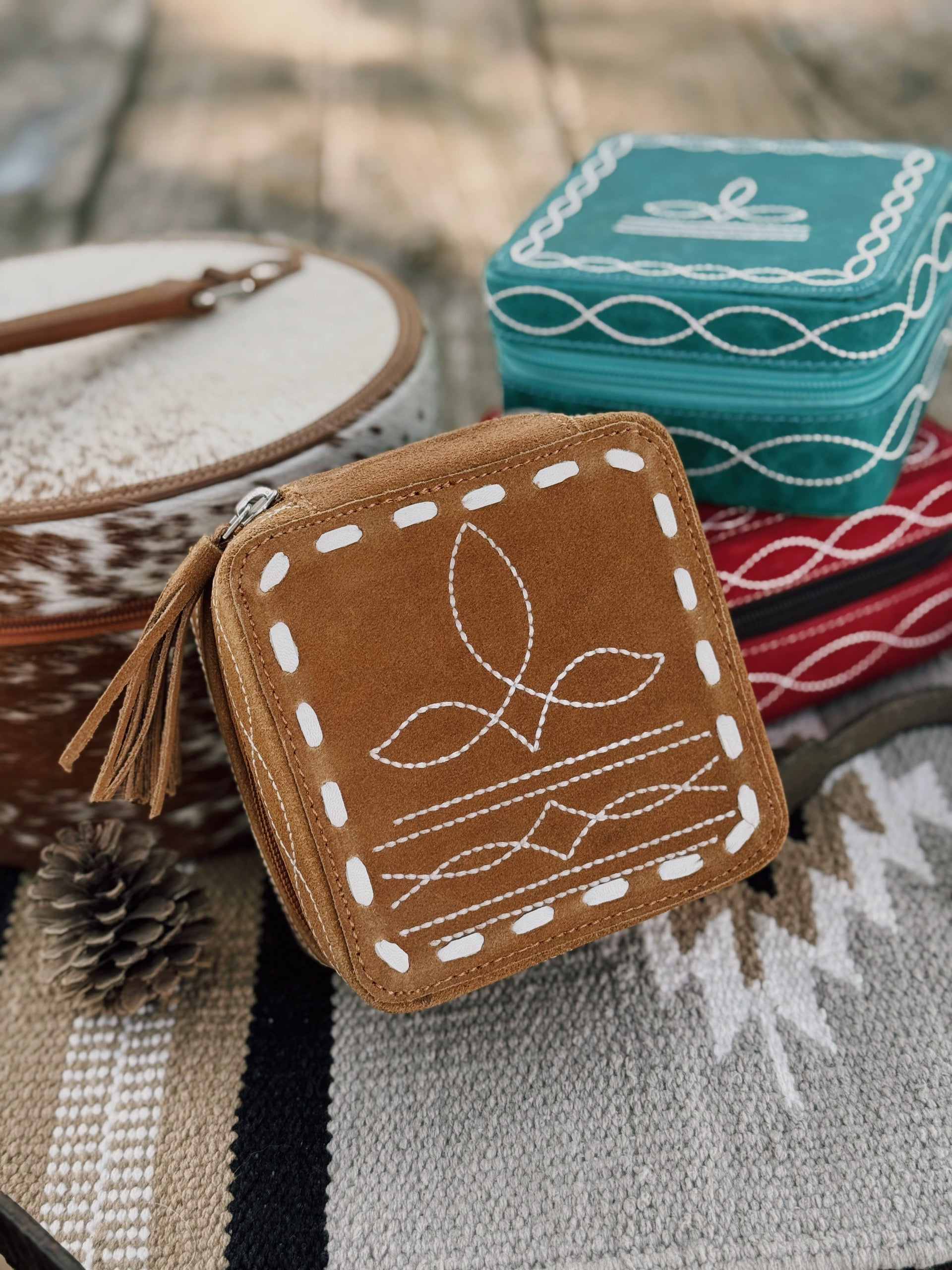 Cherry & Tan are Suede material & the turquoise is leather!